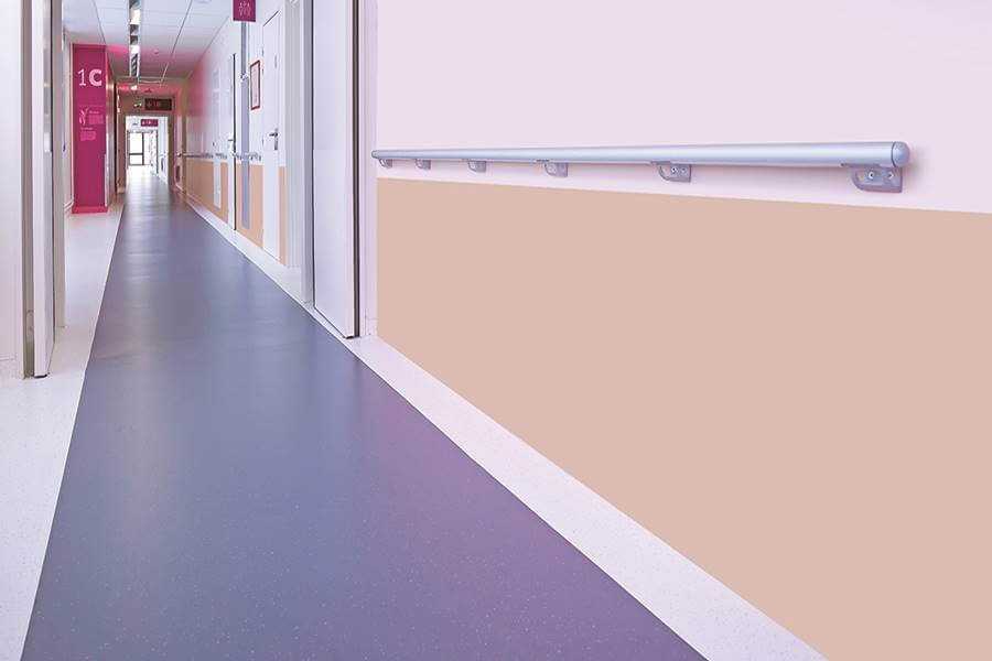 Setiap kamar operasi, ruang rawat inap maupun koridor rumah sakit dan seterusnya, lebih cenderung kena noda dan juga berbenturan dengan troly rumah sakit yang membuat dinding kotor atau kusam. Oleh karena hal itu rumah sakit menggunakan pelapis dinding yang mudah dibersihkan dan anti gores serta anti bakteri. Salah satu jenis vinyl dinding yang baik digunakan seperti produk gerflor ini, tahan terhadap benturan troly, anti gores, mudah dibersihkan dan juga anti bakteri. Dalam satu gulungan ada 60m² lebih besar dari volume gulungan vinyl lantai, Distributor lantai vinyl jual dalam bentuk gulungan, tidak jual secara meteran.
